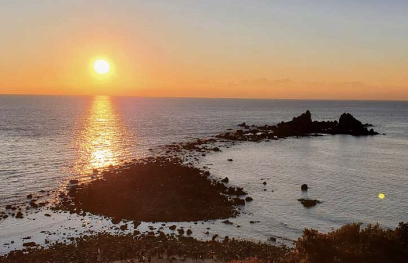 日の出時刻の6時51分頃には、水平線から昇る太陽がくっきり見られます。三ツ石のしめ縄はありませんが、自然な海の景色の中での初日の出も格別ですよ。