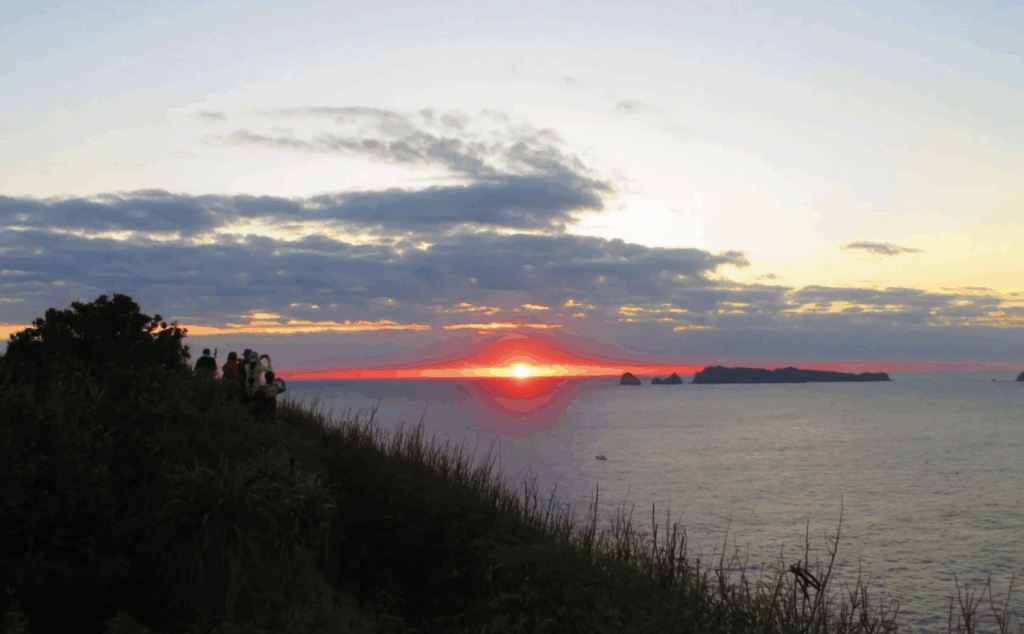 太平洋の広大な水平線から昇る朝日は本当に神々しくて、晴れていれば海面に黄金色の光の道ができる様子が見られます。この瞬間を写真に収めようと、毎年多くの人がカメラを構えているんですよ。