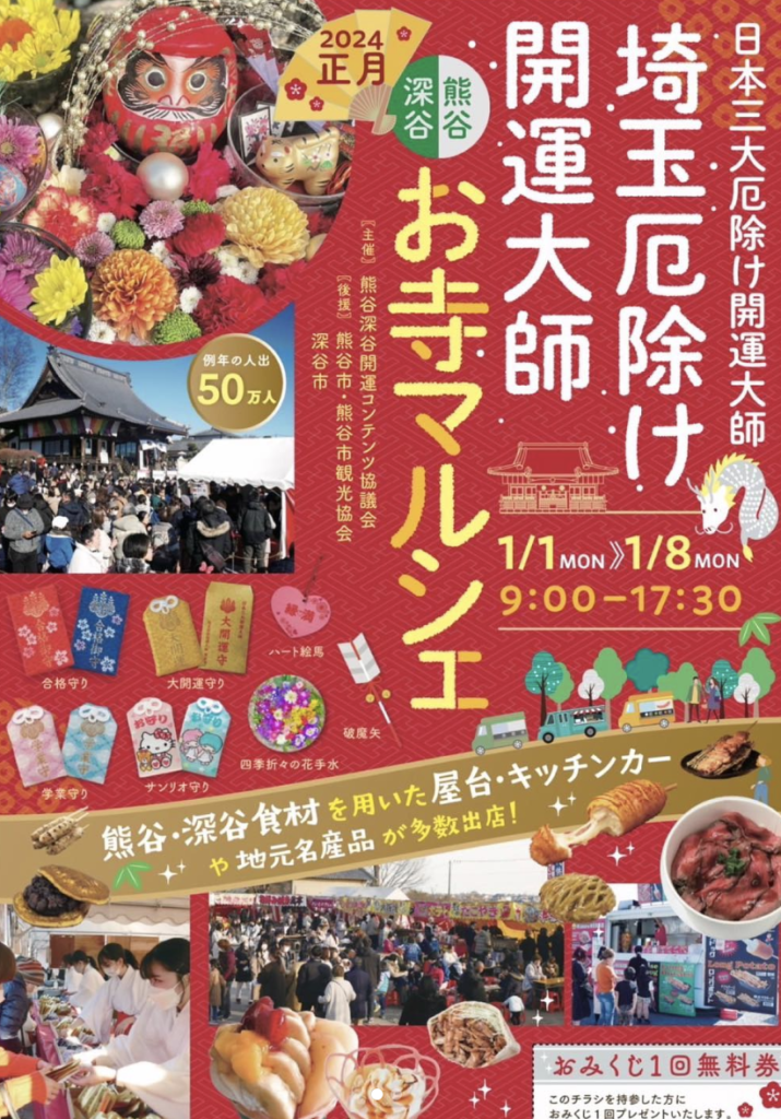江戸時代から続く県内最古のだるま市、地元グルメが楽しめるお寺マルシェ、そして屋台も多数出店。無料駐車場1,000台完備で、三が日は籠原駅から無料シャトルバスも運行されるので、電車でも車でもアクセス抜群です。