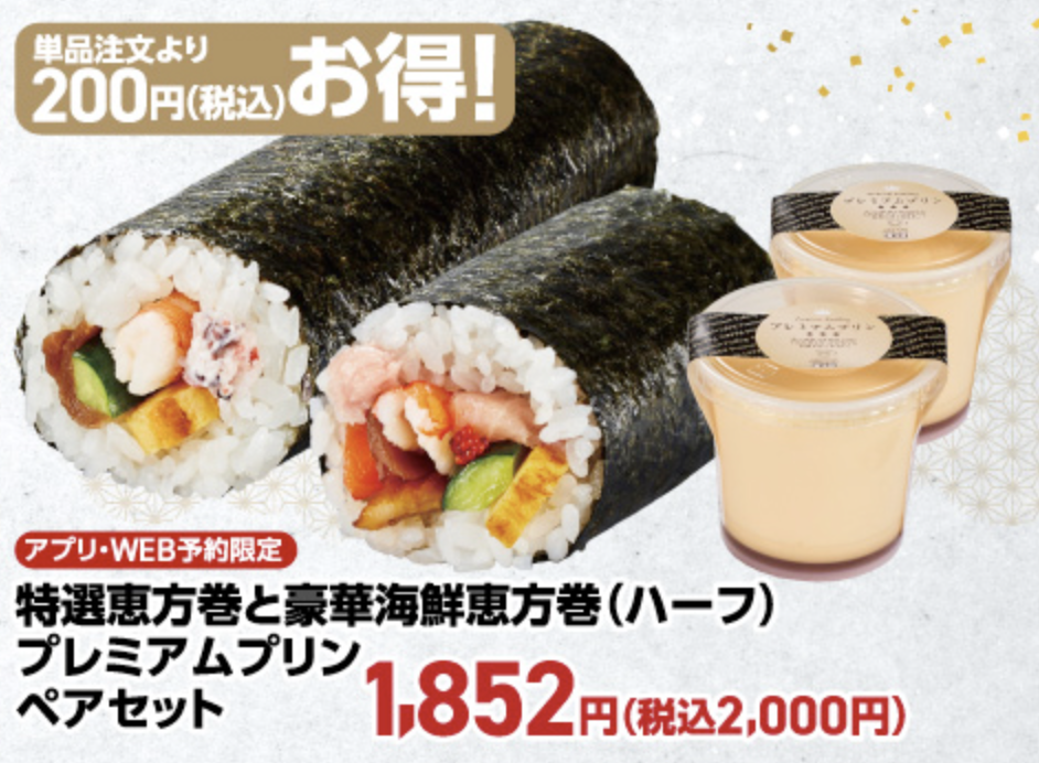 - 今年は580円からの特選恵方巻きと、中とろ入り豪華海鮮恵方巻き(ハーフ)600円の2種類が登場。