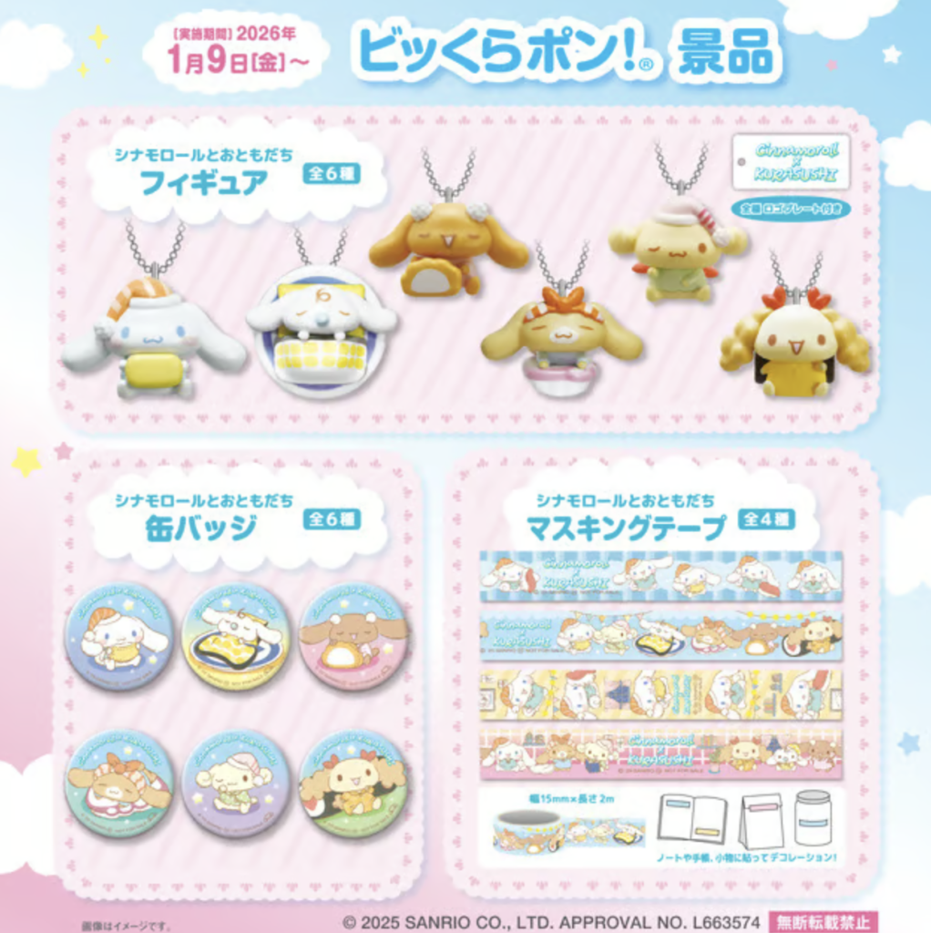 お会計500円ごとに1回挑戦できるビッくらポン!に、シナモロールのお寿司モチーフグッズが登場しています。